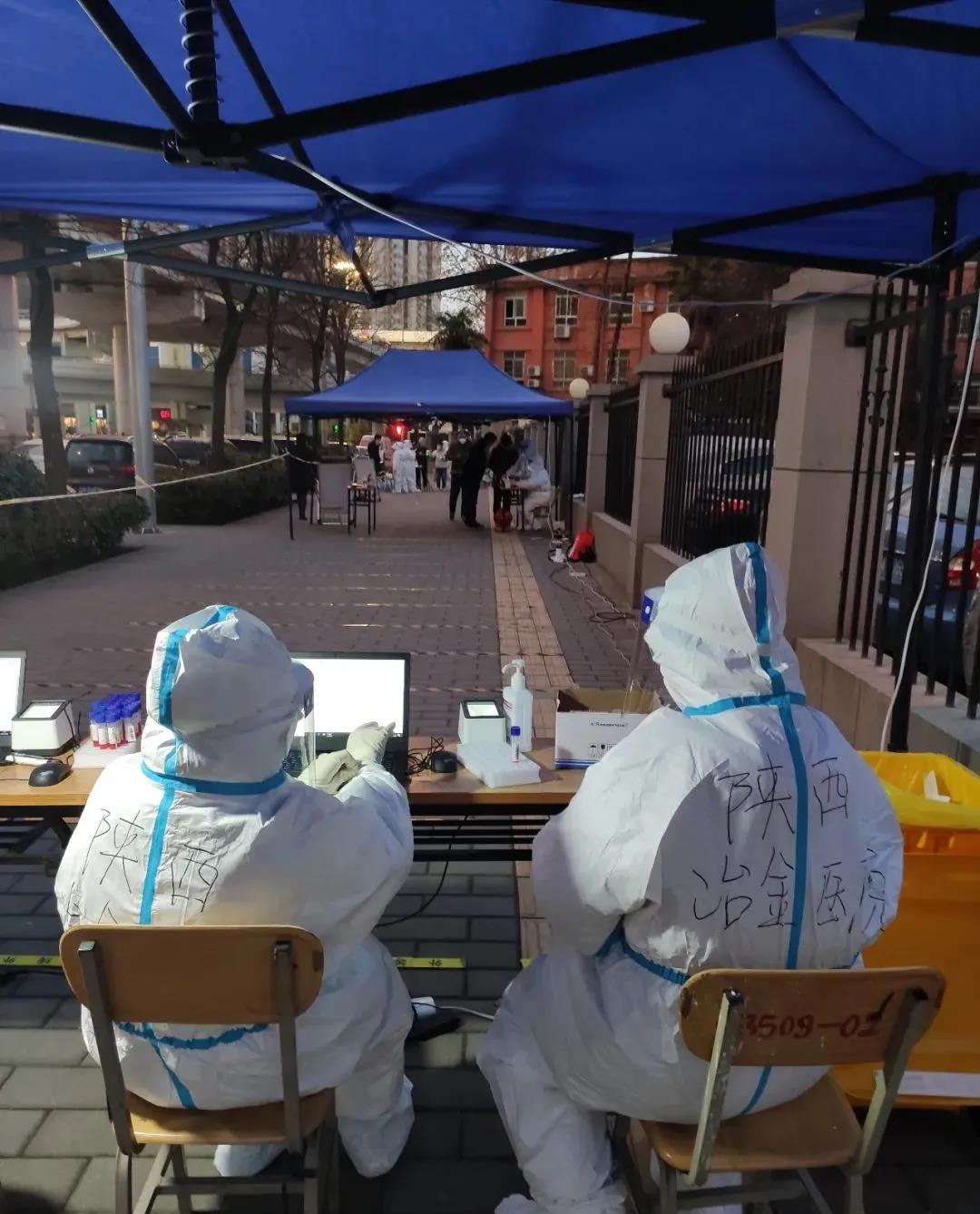 陕西冶金医院“大白”们,不眠不休,通宵奋战在核酸采样一线。他们分批先后前往田家湾、司法小区、建工路东西路口、铁道技师学院、砖厂办公楼、凯森盛世等地连夜开展全员核酸采样工作。