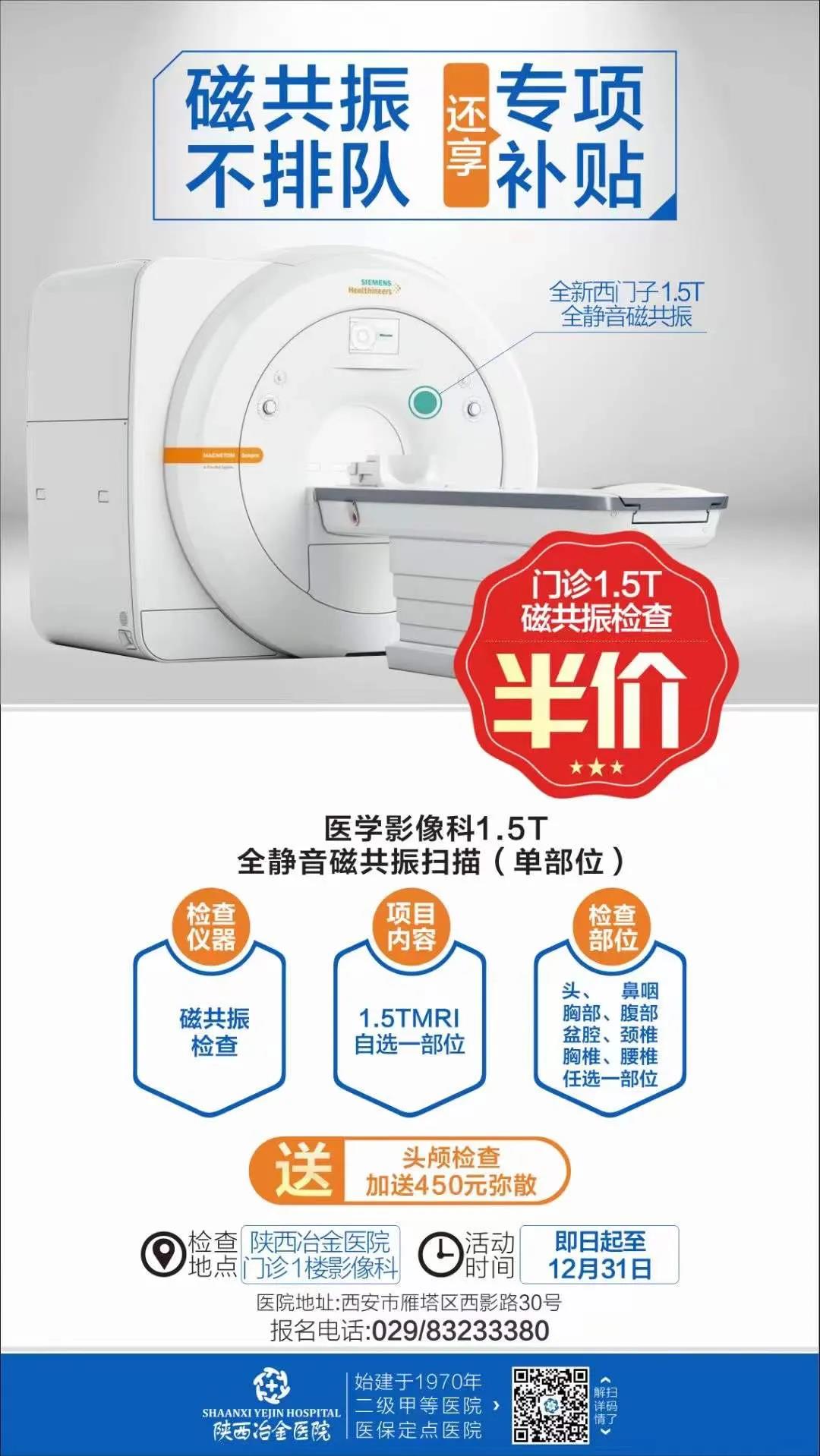 经院委会研究决定:即日起-12月31日,正式启动门诊1.5T全静音磁共振检查项目半价惠民活动(原价550元/部位,头颅检查还加送450元弥散),欢迎市民前来预约检查。