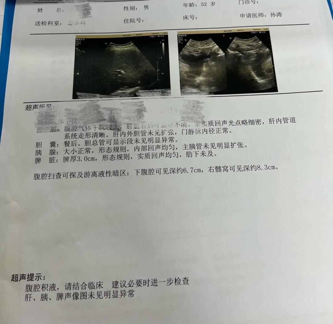 ▲腹部B超提示:腹腔积液