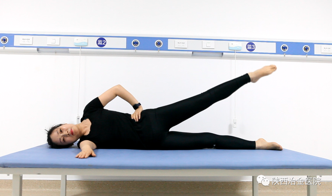侧卧位,一侧下肢缓慢抬升至45°,稍作停顿,缓慢回到起始位置。左右互换,重复5~10次。
