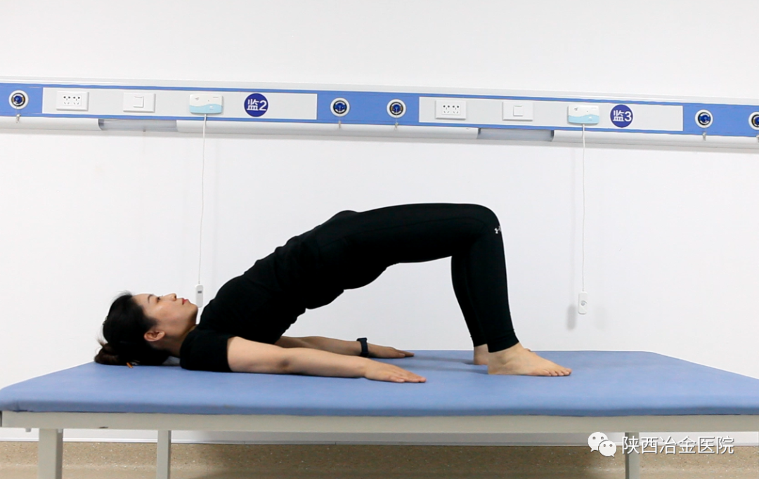 改良腰桥 仰卧位,双腿屈膝全脚掌着床,尽力使臀部远离床面,腹部下压,保持5~10秒,重复5~10次。