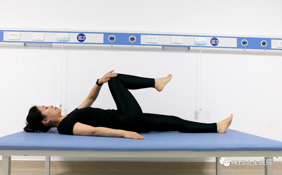 仰卧位,双膝并拢于胸前,从身体一侧向另一侧滑落至床面,稍作停顿,左右互换,重复5~10次。