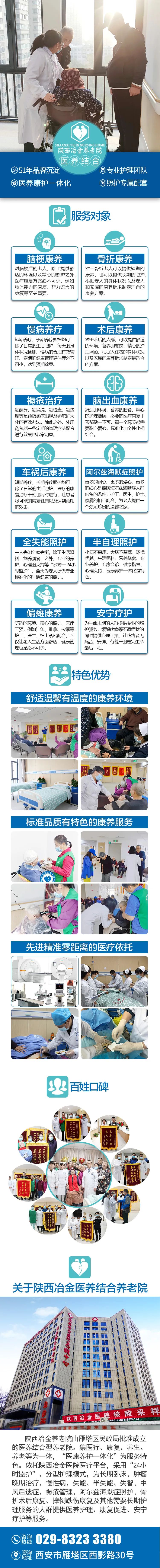 陕西冶金医养结合养老院由雁塔区民政局批准成立的医养结合型养老院。集医疗、康复、养生、养老等为一体,“医康养护一体化”为服务特色。依托陕西冶金医院医疗平台,采用“24小时监护”、分型护理模式,为长期卧床、肿瘤晚期治疗、慢性病、失能、半失能、失智、中风后遗症、褥疮管理、阿尔兹海默症照护、骨折术后康复、摔倒跌伤康复及其他需要长期护理服务的人群提供医养护理、康复促进、安宁疗护等服务。