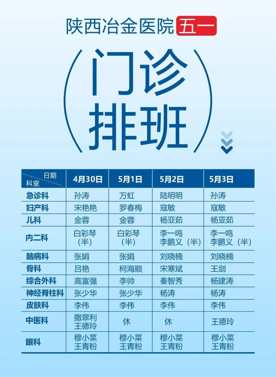 陕西冶金医院五一门诊排班