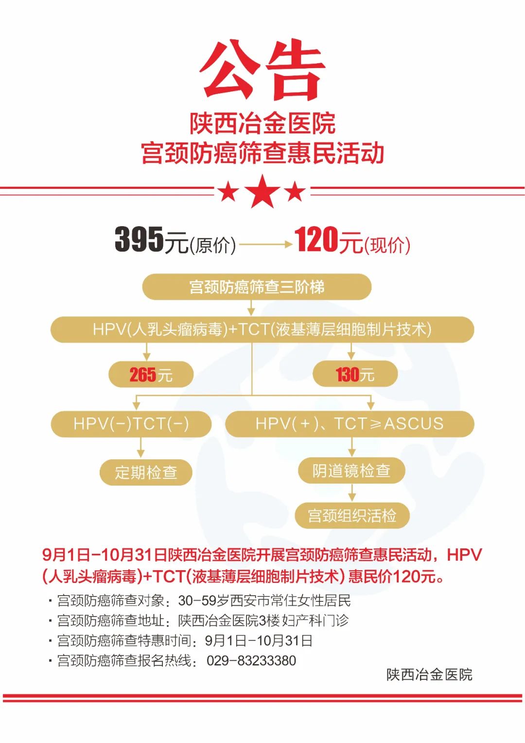 9月1日-10月31日,陕西冶金医院开展宫颈防癌筛查惠民活动。HPV(人乳头瘤病毒)+TCT(液基薄层细胞制片技术) 惠民价120元!