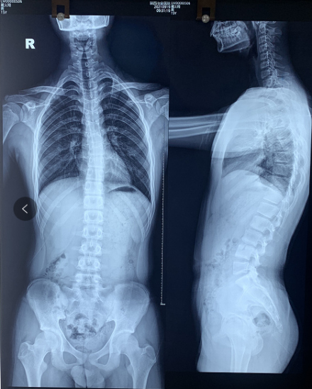 说着安主任就开始认真仔细地给患者进行查体,现症见:脊柱C型改变,左肩高于右肩,左背高于右背;X光片显示:T3-T3左凸右弯17度,诊断为“青少年特发性脊柱侧弯”收入我科进行治疗。