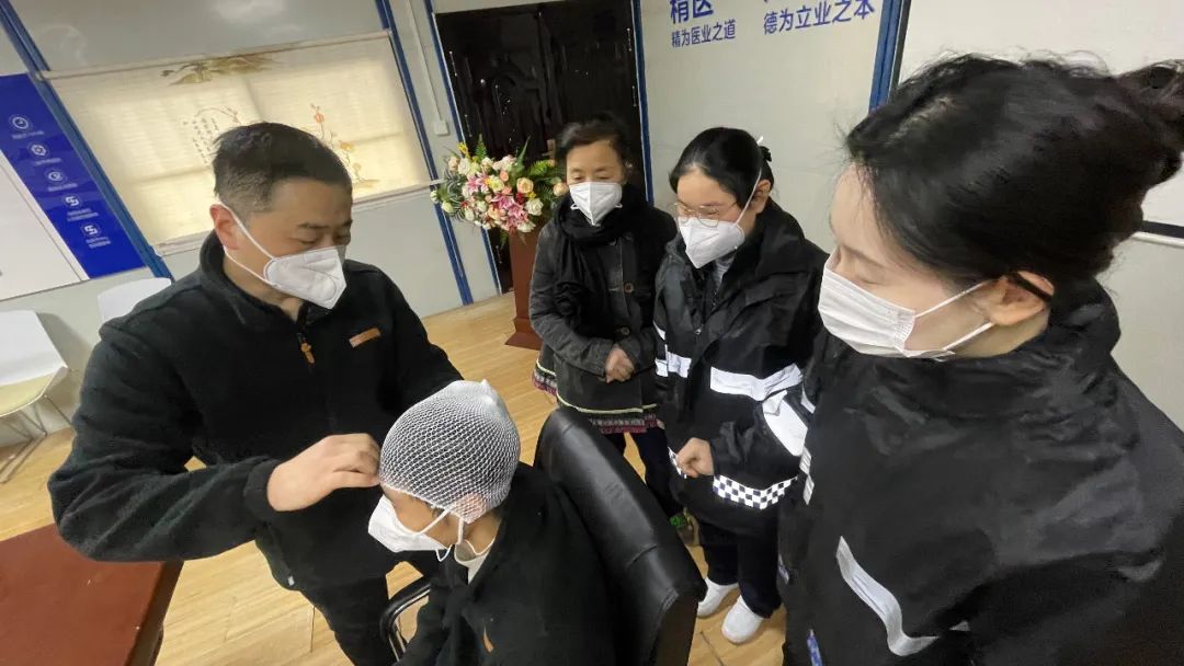 ①在伤口部位覆盖敷料后摁住,用绷带从伤口处开始往返缠绕,最后绕头一周形成帽状固定住所有绷带。