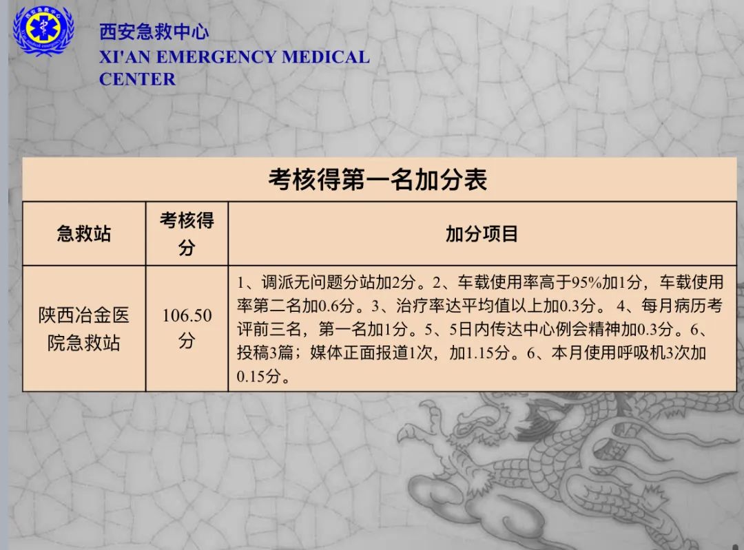 在西安急救中心全市八月份质量考核考评中,陕西冶金医院120急救站再次荣获全市第一名,这是也是陕西冶金医院120急救站连续五个月获奖。