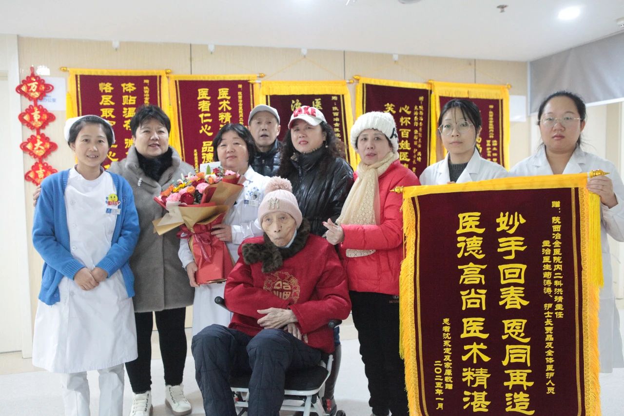 为表感激,出院时家属特意送来锦旗与鲜花,