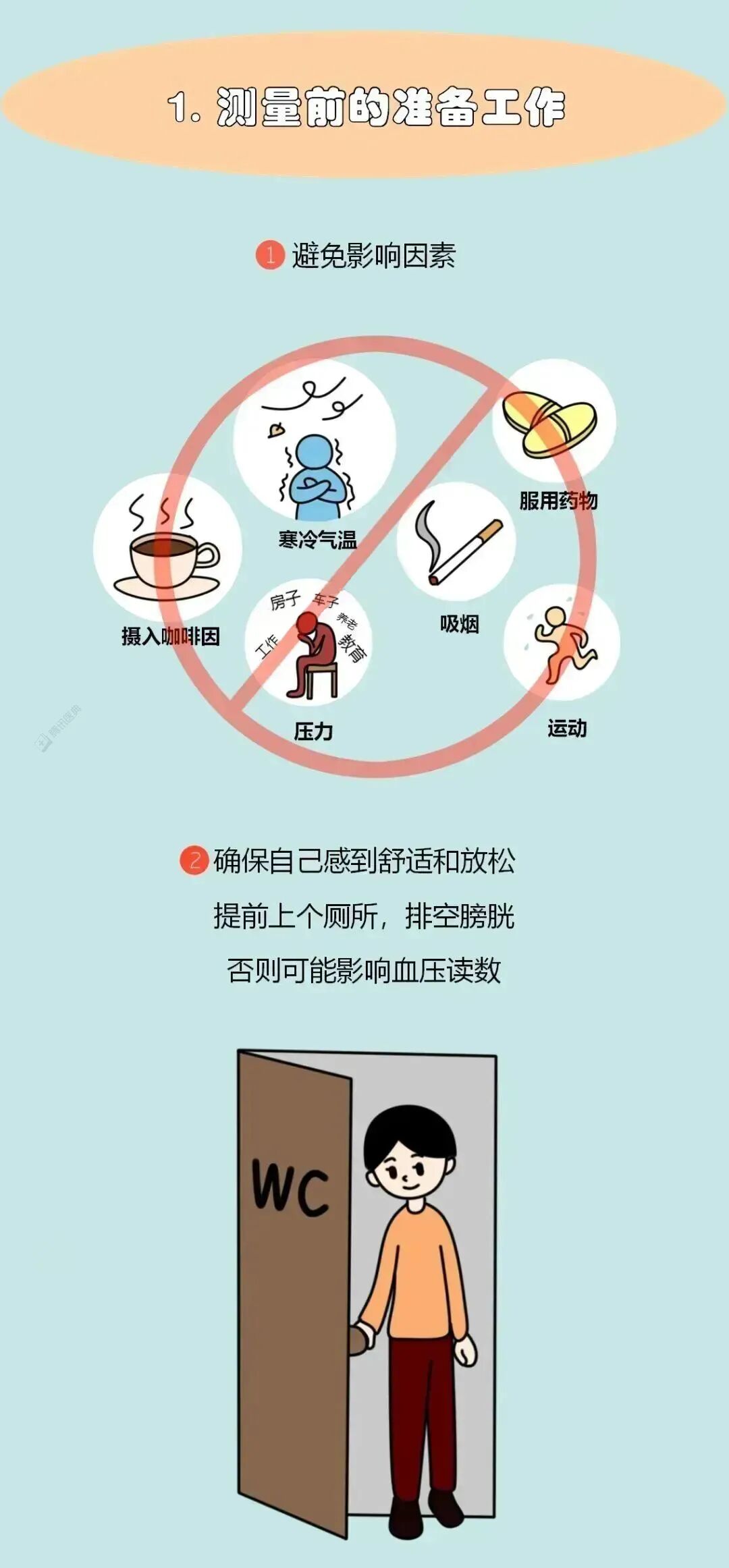 测血压前30分钟避免喝咖啡、喝酒及吸烟,坐靠背椅休息3~5分钟,测压时最好不要说话或交谈。
