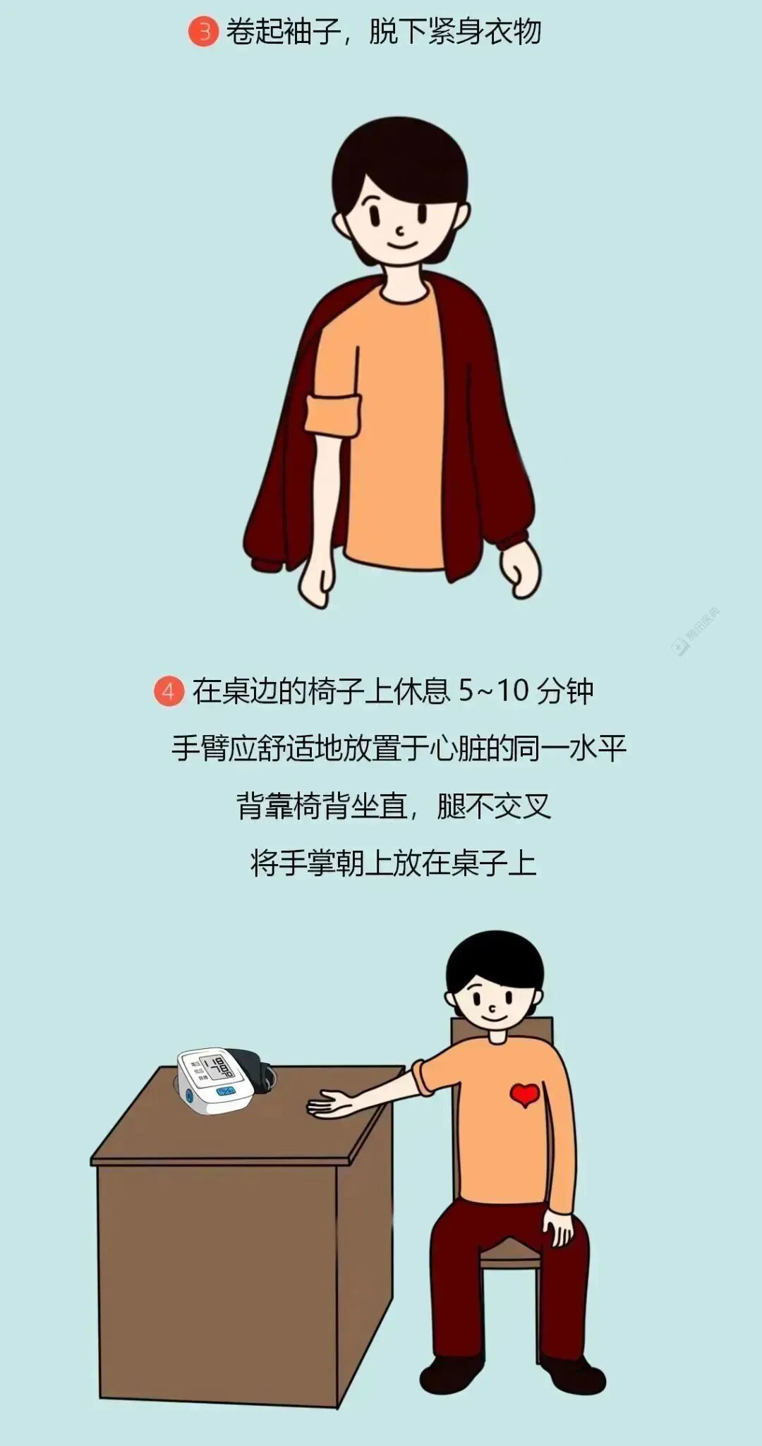 测量时,上臂袖带中间要与心脏处于同一水平线,最好将手臂伸直放在桌上,保持舒适姿势。