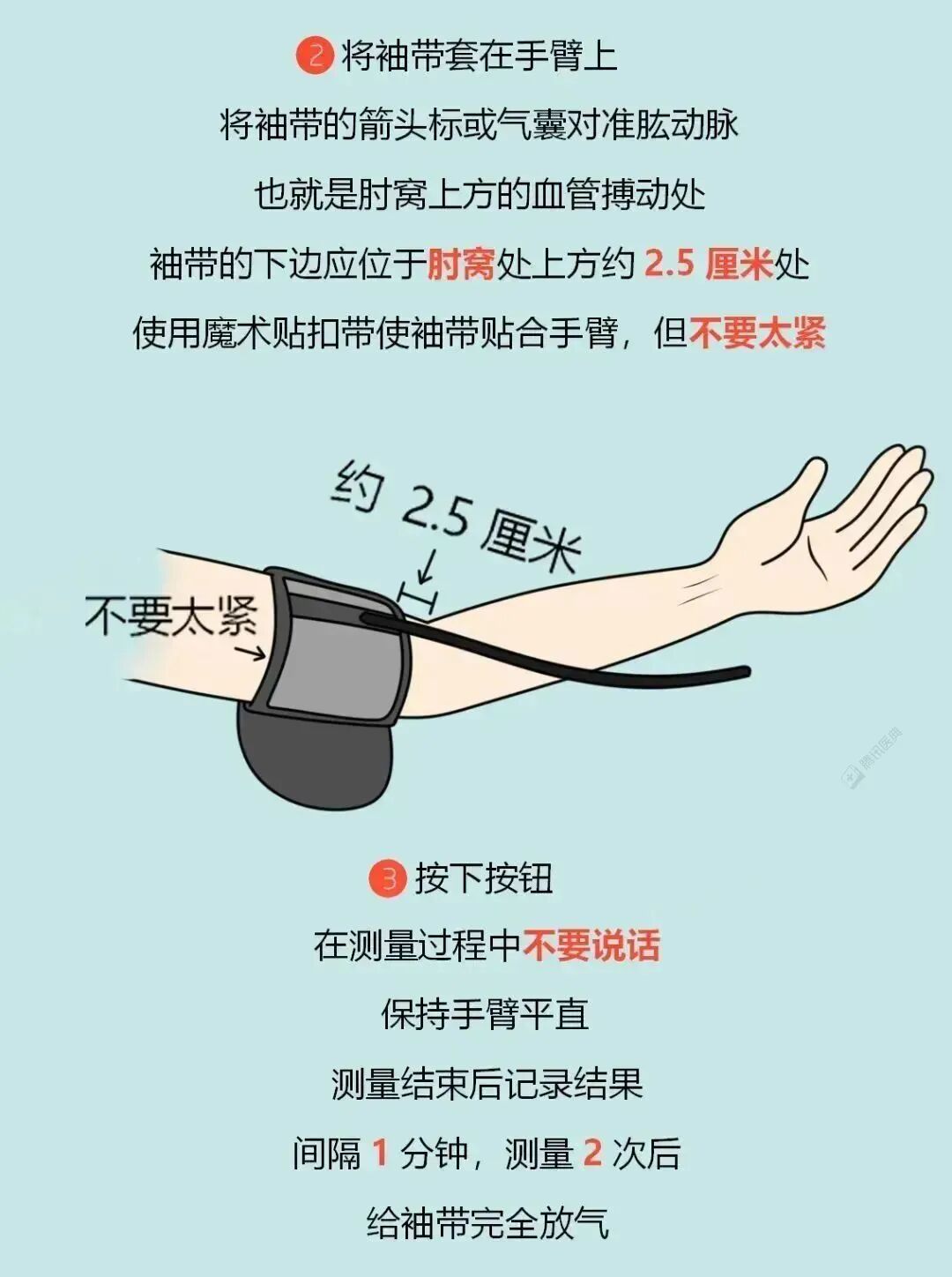 使用大小合适的袖带,袖带气囊中部放置于上臂肱动脉的上方,袖带边缘不要卷起,袖带的下缘在肘窝上方2~3厘米。
