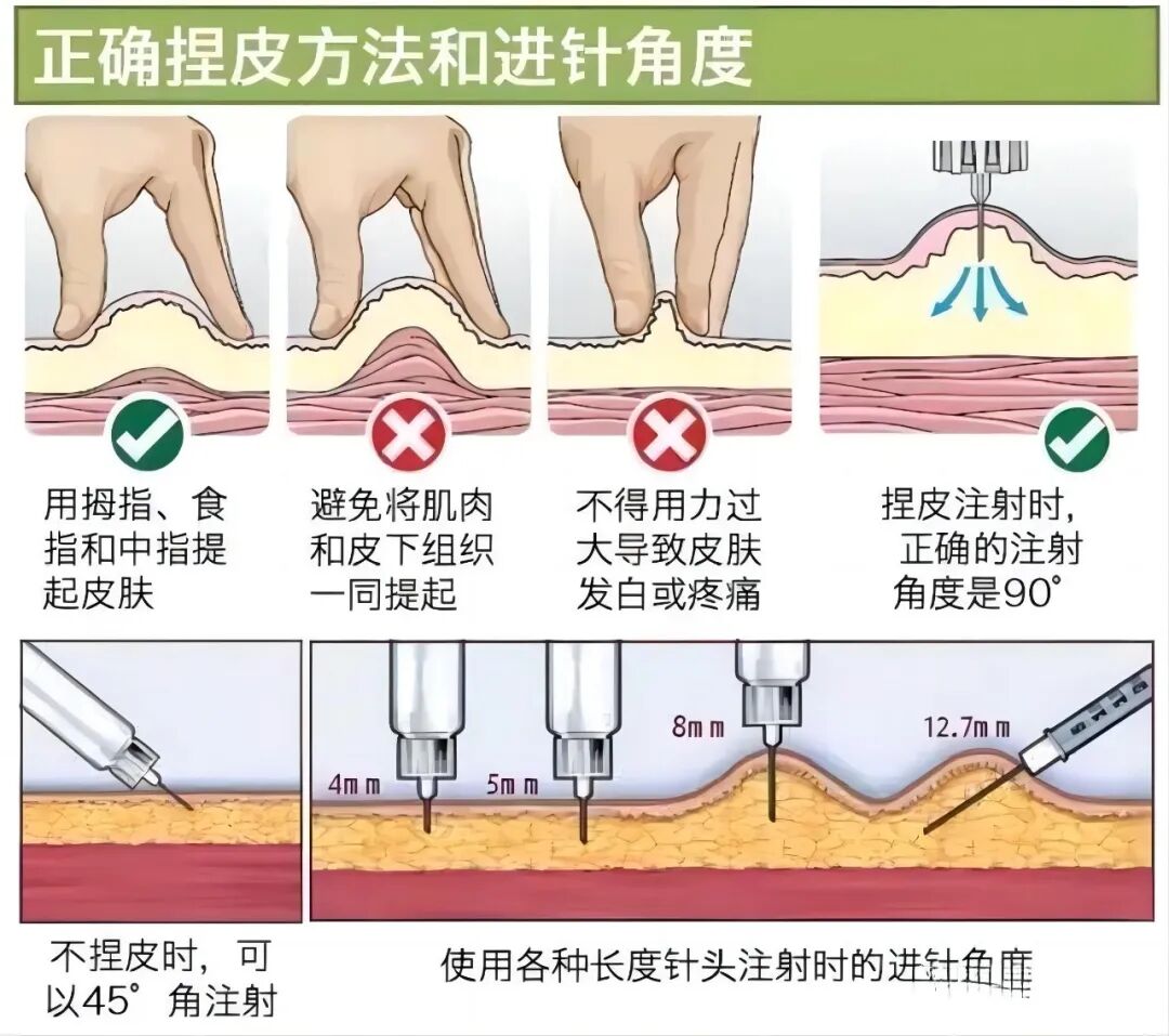 7.根据胰岛素注射笔针头的长度,明确是否捏皮及进针角度,大部分成人4mm和5mm针头无需捏皮,垂直进针即可。