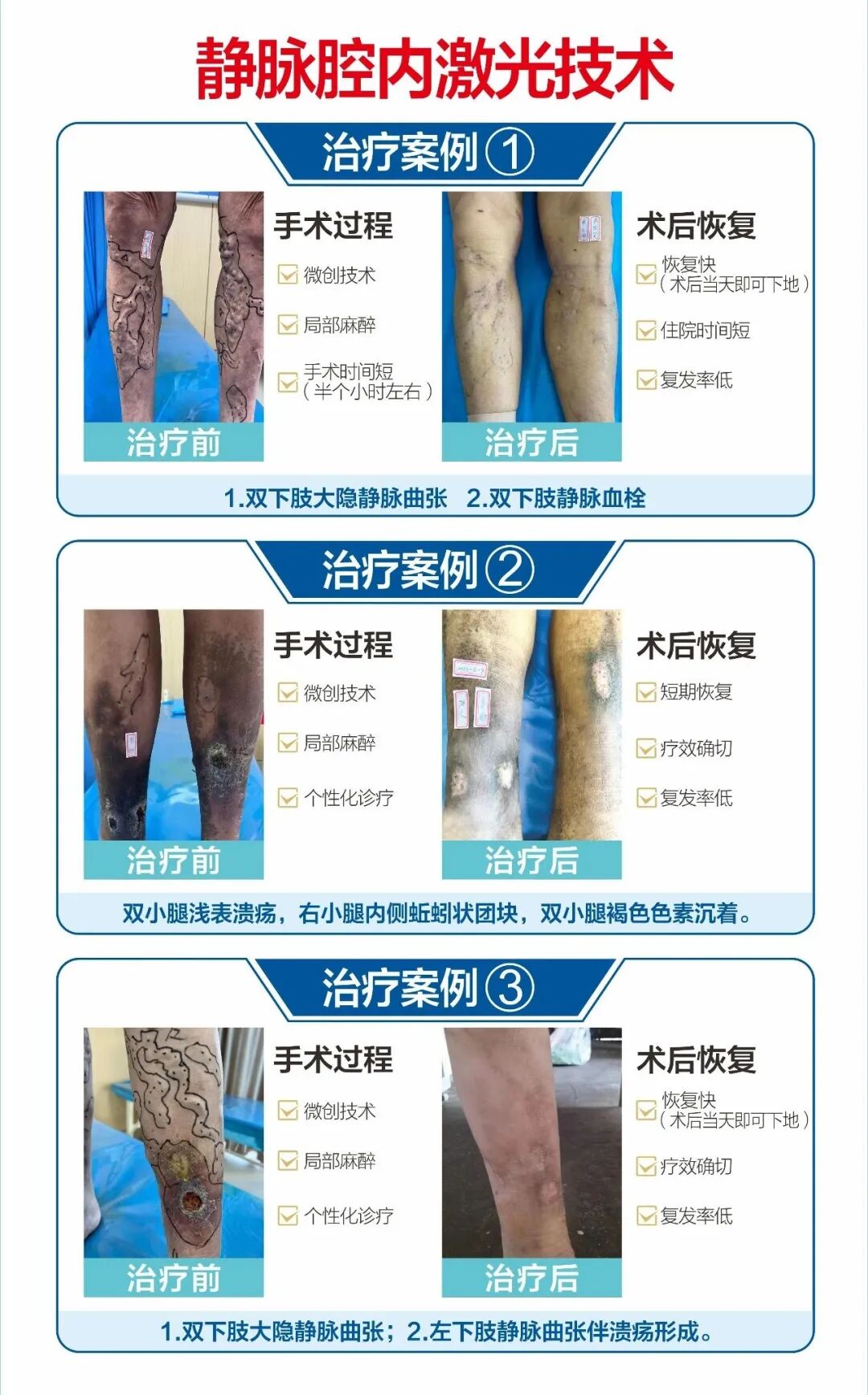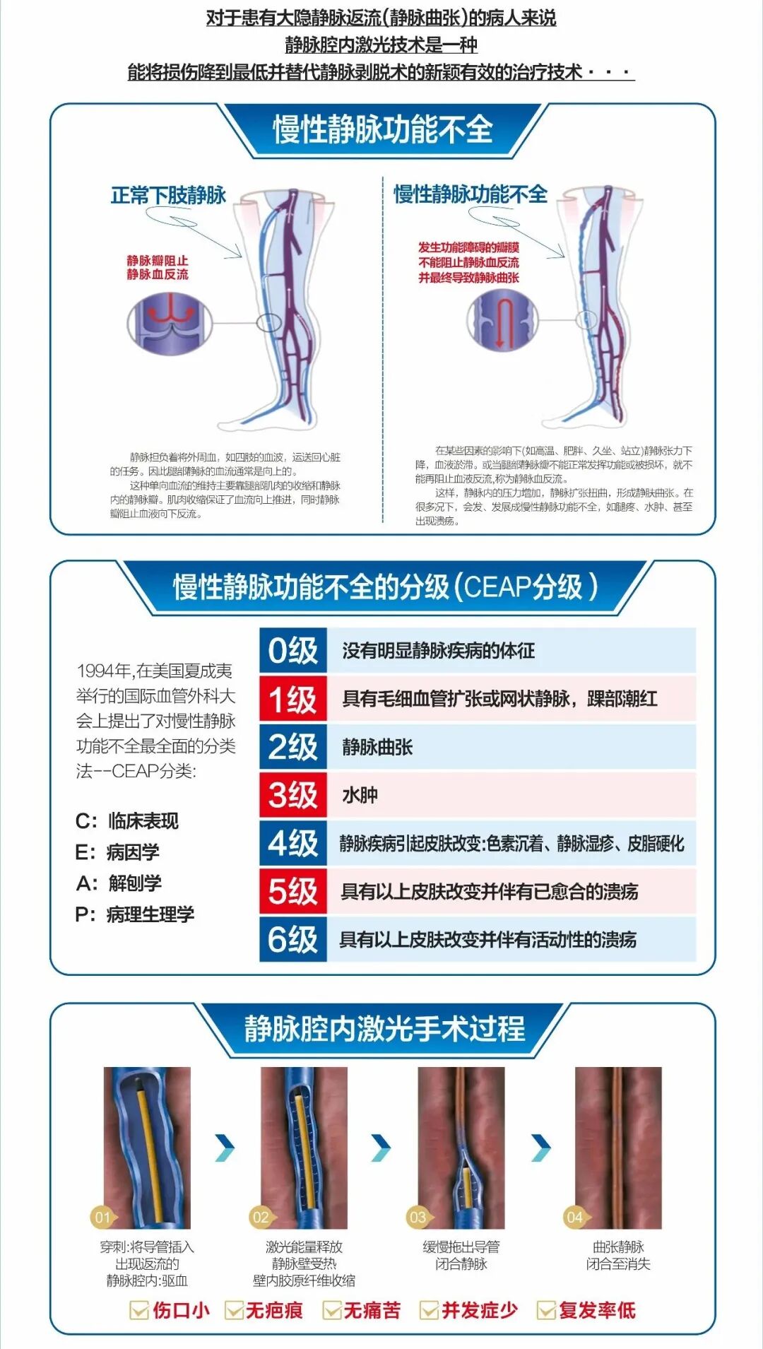 临床血管外科医生常结合分类参考临床表现,2级以上需进行微创手术治疗,从而改变下肢静脉曲张的临床症状。实践证明,只有微创手术(激光或微波)才能得到预期的治疗效果。