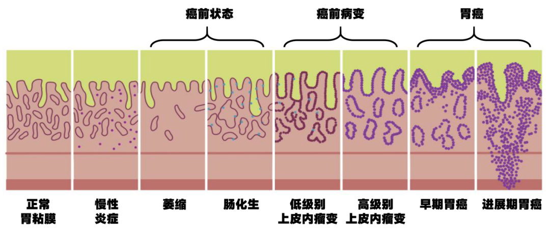 近年来,人们通过研究发现,胃癌的发生需要一个过程,会先后经历正常胃黏膜、慢性胃炎、多灶性萎缩性胃炎、不同程度的肠上皮化生、低级别上皮内瘤变、高级别上皮内瘤变、早期浸润性癌、浸润性癌。这是一个漫长的过程,在中间环节积极干预,就可避免胃癌的发生。