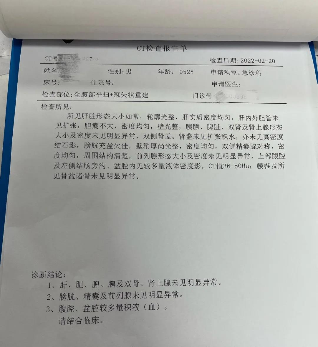 李先生到院后,接诊医生仔细问诊、查体。一边做着抗休克治疗,一边快速进行腹部B超和腹部CT检查。经行腹部CT、B超结果显示:腹腔、盆腔较多量积液(血)。结合患者病史,初步考虑为闭合性的腹部外伤导致的腹腔出血,内脏损伤。急诊科在积极补液的情况下,第一时间通知外科专家团队,急诊绿色通道开启,遂将患者收入外科。