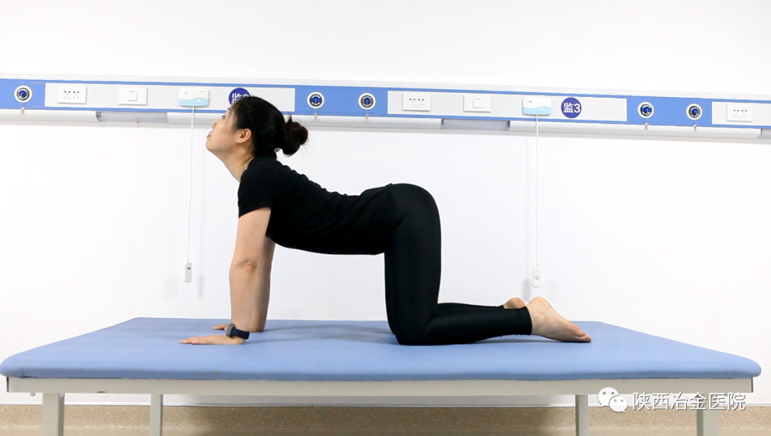 跪在床上,双膝打开与肩同宽,小腿和脚背紧贴在床上,脚底向上。吸气时,慢慢地将臀部翘高,腰向下微曲,头部上扬,形成一条弧线。呼气时,慢慢地把背部向上拱起,带动脸向下方,视线望向大腿位置,直至感到背部有伸展的感觉,重复5~10次。