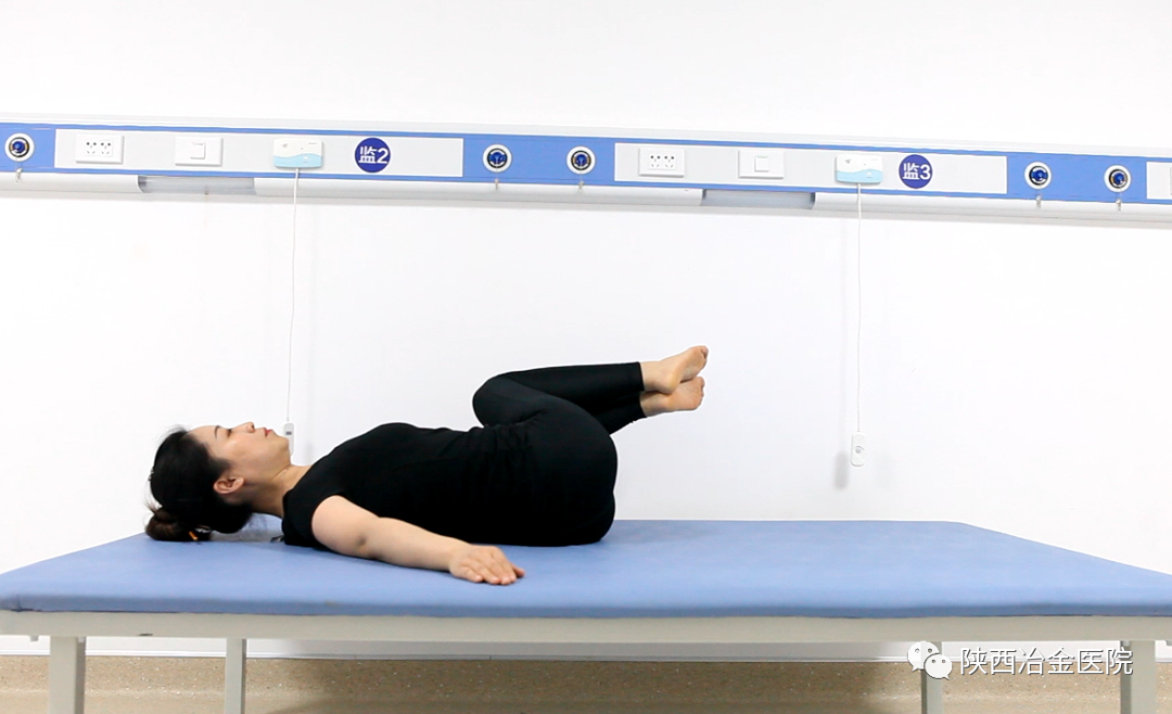 仰卧位,双膝并拢于胸前,从身体一侧向另一侧滑落至床面,稍作停顿,左右互换,重复5~10次。