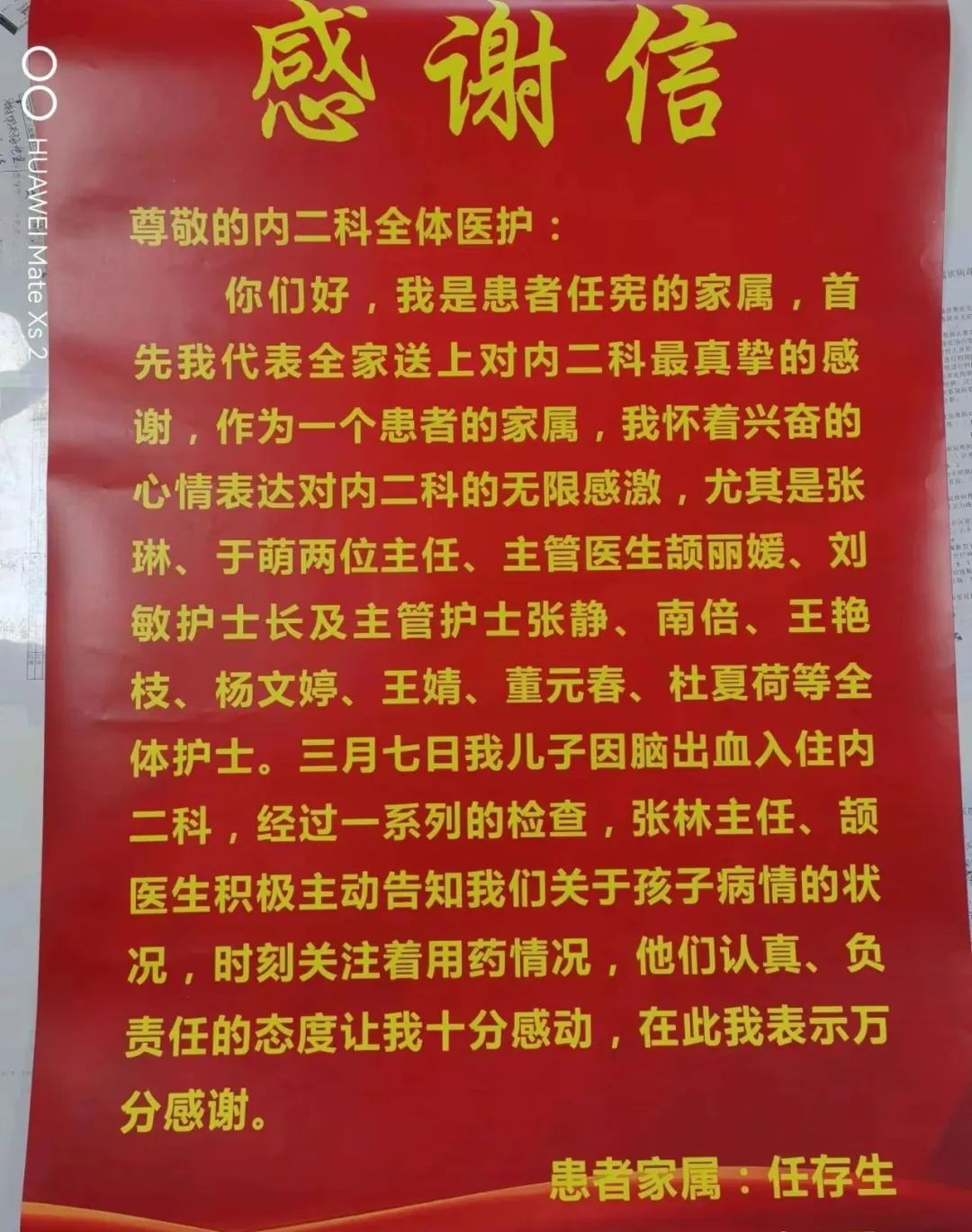 患者马某,因胸闷、言语不利于,3月收治陕西冶金医院内一科。住院期间,内一科青年医生刘盼本着负责、敬业、爱患的精神从入院到出院用言语及行动为患者去除了病痛,安慰了心灵,稳定了情绪,解除了后顾之忧。患者及家属为表谢意,特送来一封感谢信。感谢信里朴实的语言和真挚的情感,既是对医务工作辛勤工作的认可,更是对医院医疗技术的肯定。