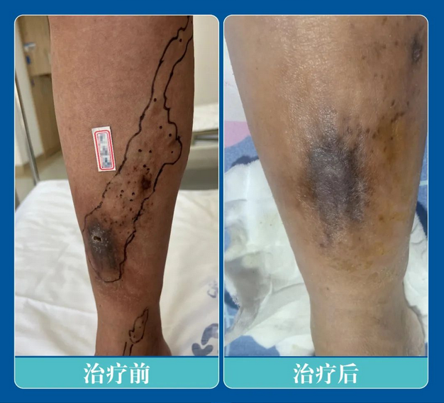 上个月,就来了一位47岁的静脉曲张伴溃疡患者。患者3年前发现双下肢静脉迂曲(右侧为著),无下肢疼痛症状,未曾诊治,未经过相关治疗,2月前右下肢出现溃烂,外院对症抗炎换药后愈合,现呈块状溃疡。现为进一步治疗遂到陕西冶金医院血管外科就诊。经过TEVV静脉腔内综合治疗,下肢皮肤溃疡愈合良好,现已康复出院。