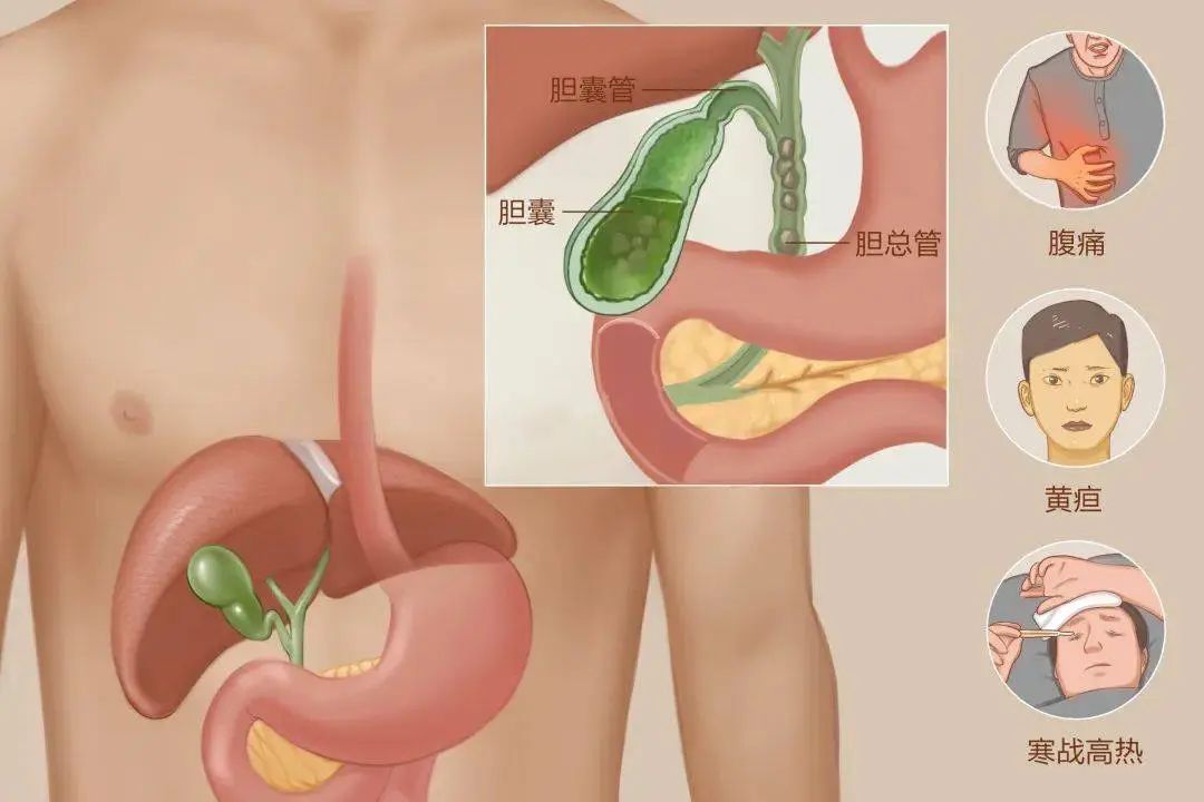 腹痛:结石阻塞胆管,胆汁排泄不畅,胆道感染,导致腹部胀痛;黄疸:胆汁排泄不畅,胆汁淤积入血,引起全身皮肤和眼睛发黄;发热:结石阻塞胆管,滋生细菌,胆道感染,从而引起发热。
