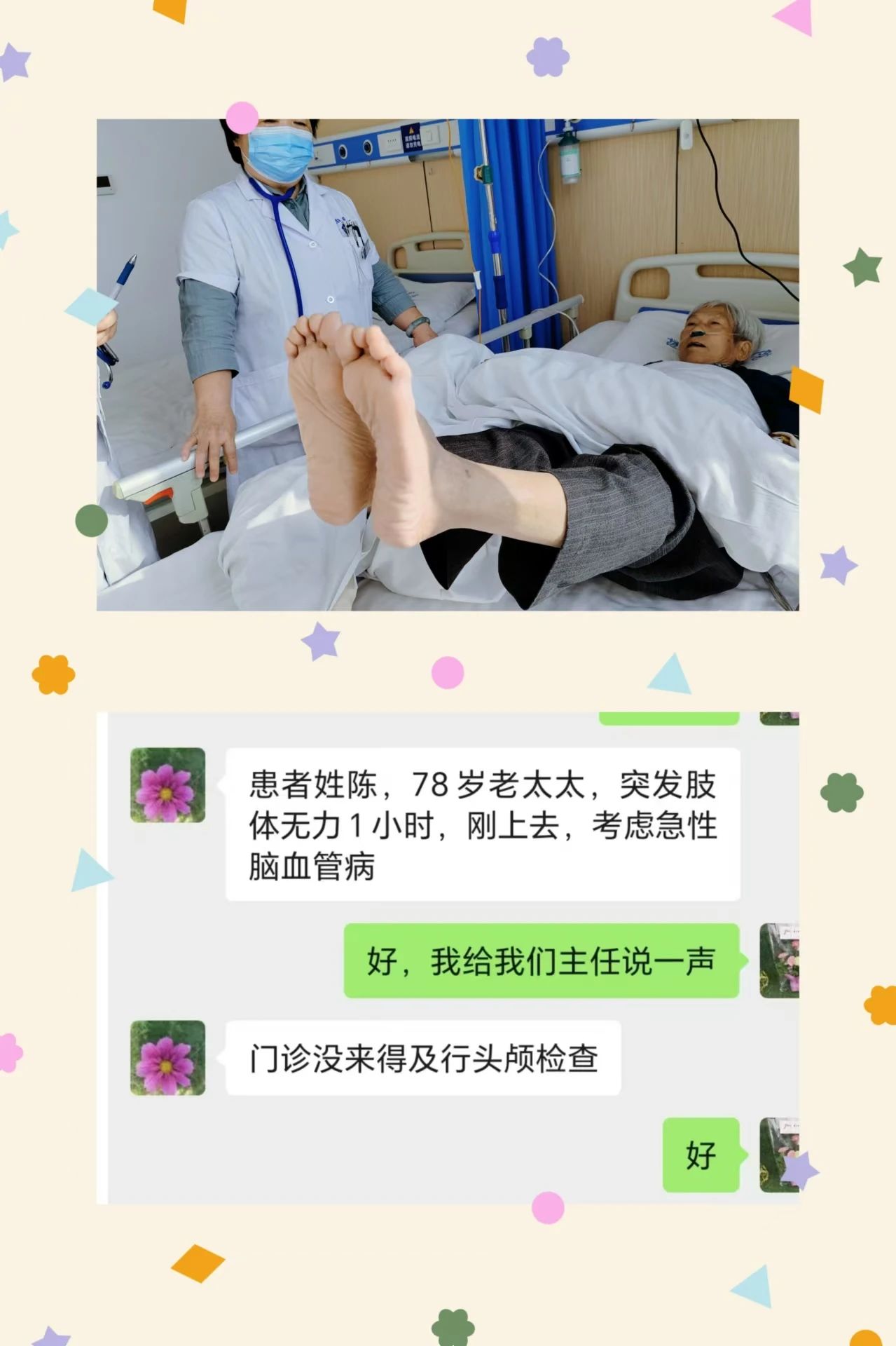 78岁的患者陈老人,以“左侧肢体无力”为主诉入院。陕西冶金医院门诊白彩琴主任根据患者主诉,判断考虑“急性脑梗死”后,立即联系内二科洪婧主任。洪主任迅速启动绿色通道,安排急查血及头颅CT,排除脑出血及主动脉夹层。