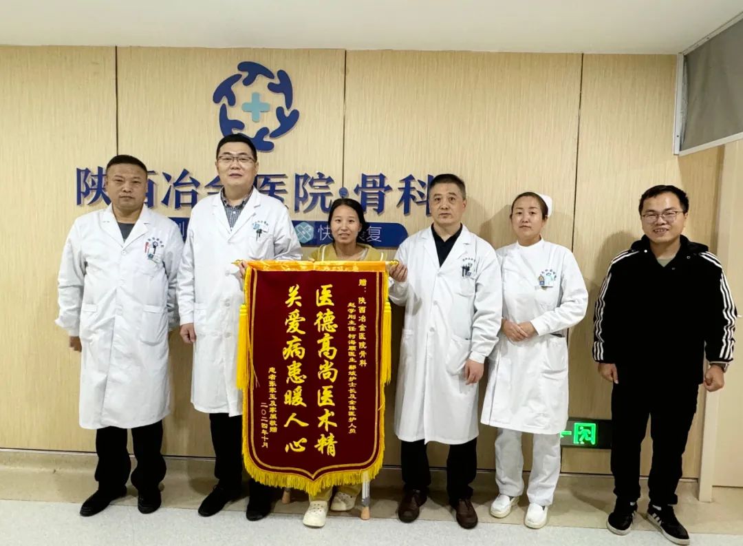 经多方打听得知,陕西冶金医院骨科微创治疗效果显著,于是刘阿姨便来院接受治疗。术前诊断:腰椎间盘突出伴坐骨神经痛。骨科鄢云峰副主任医师依据病情特点,在全麻下行腰5-骶1椎间盘镜下突出髓核摘除术。术后6小时,刘阿姨即可下地活动,下肢疼痛症状也完全消失。手术三天后,刘阿姨康复出院。为表达感激之情,刘阿姨及家属特将鲜红的锦旗献给骨科医护团队。