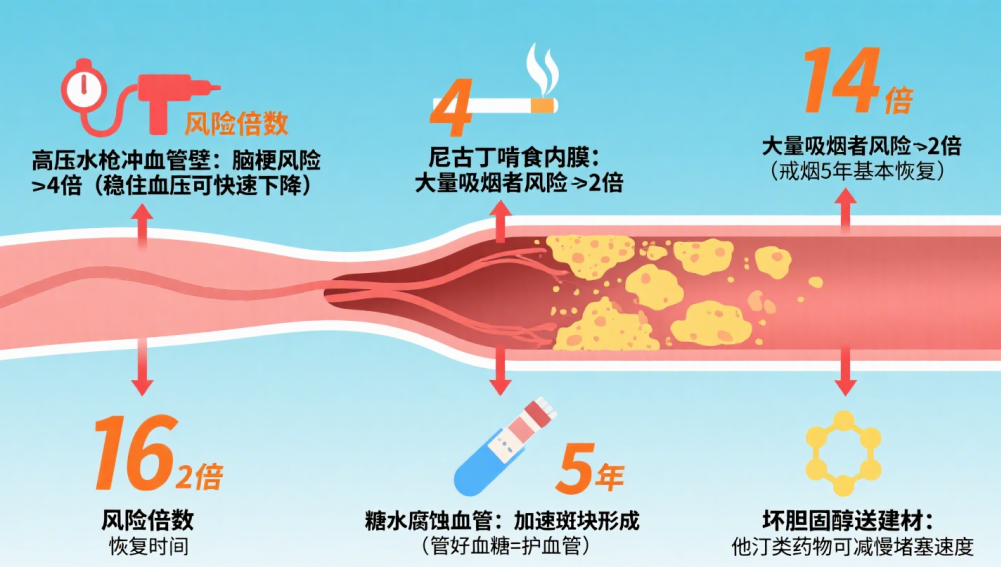 3、糖尿病:高血糖环境就像用“糖水”浸泡血管,会慢慢腐蚀血管内皮。这不仅容易催生斑块,还会显著提高脑梗的死亡率。