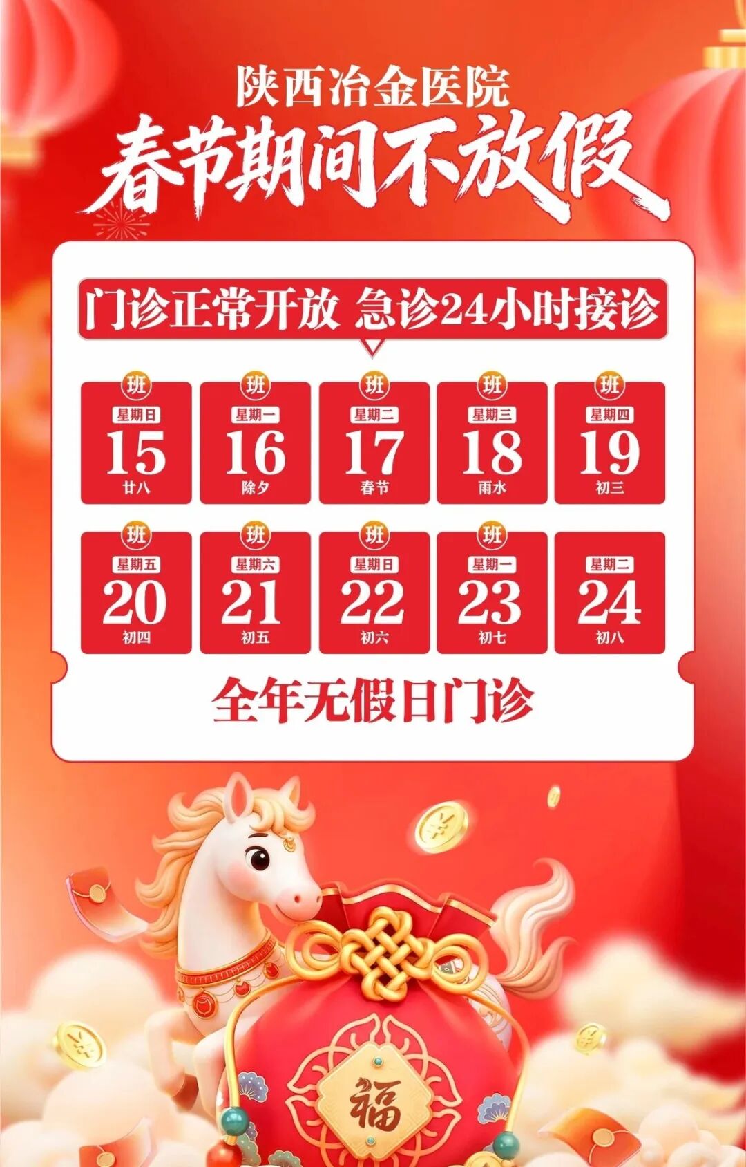 春节期间,陕西冶金医院实行“全年无假日门诊”2月15日-2月23日期间门急诊正常接诊,春节期间康俊院长携科室专家出诊,医技科室同步值守,保障就医需求。