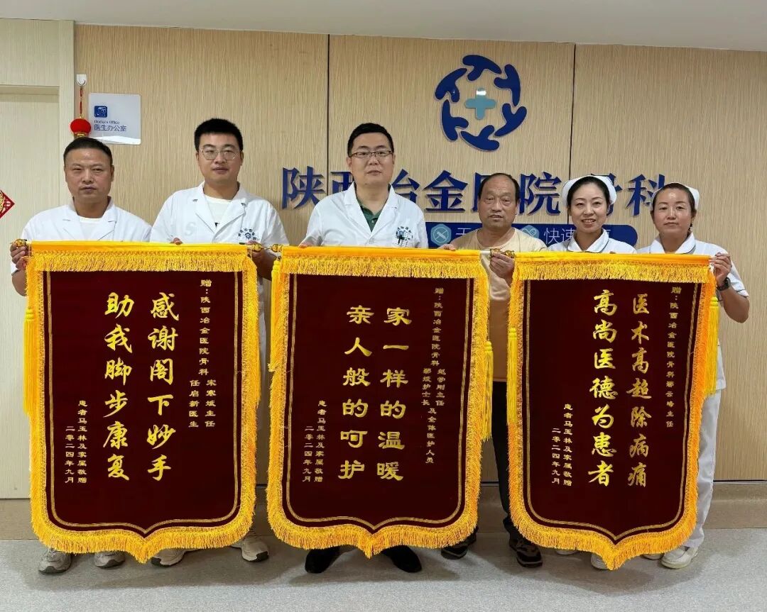 “没想到恢复这么好,感谢骨科医护及时救治和细心照顾,锦旗请你们一定要收下!”9月1日上午,患者马先生激动地将三面锦旗送到陕西冶金医院骨科团队手中。