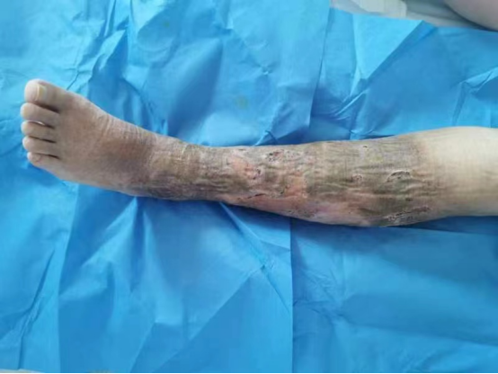 20年糖尿病,8年右小腿慢性创面患者,辗转多家医院,迁延不愈。经病友介绍来陕西冶金医院骨科、创面修复科治疗,经过血管CTA检查,多次清创、闭式引流系统负压吸引,自体皮移植,漫漫征程,历时20余天,终于治愈。