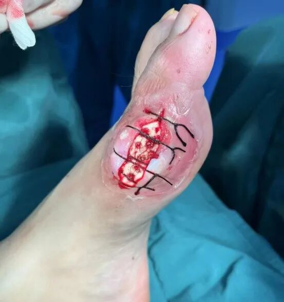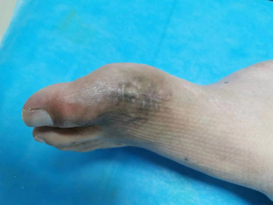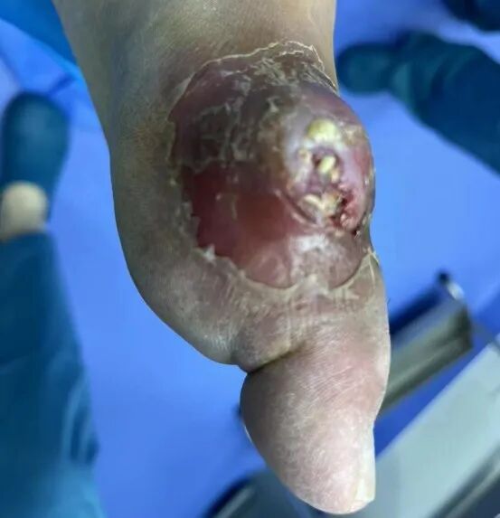 痛风病史8年,左足痛风石形成破溃感染,行痛风石清除扩创,抗生素骨水泥占位。