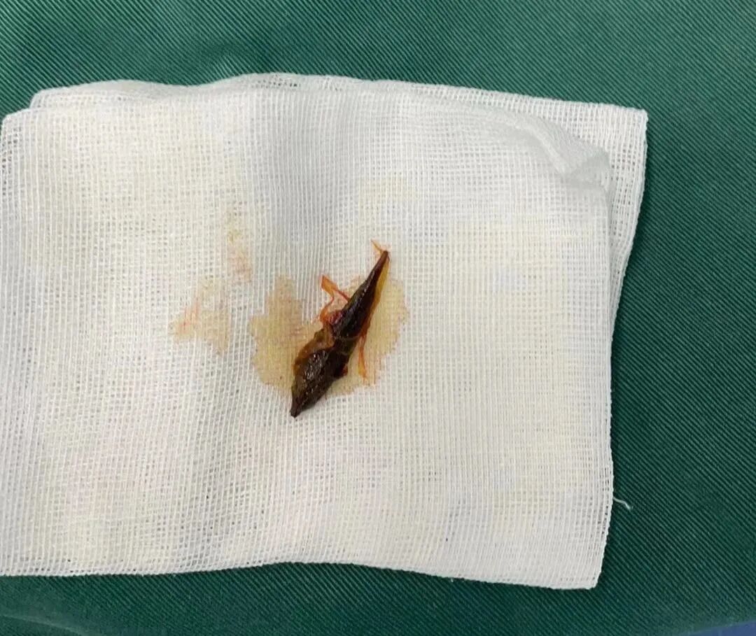 可以看到,取出的枣核一端尖如针头。术后,王阿姨情况平稳,正在进一步恢复中。