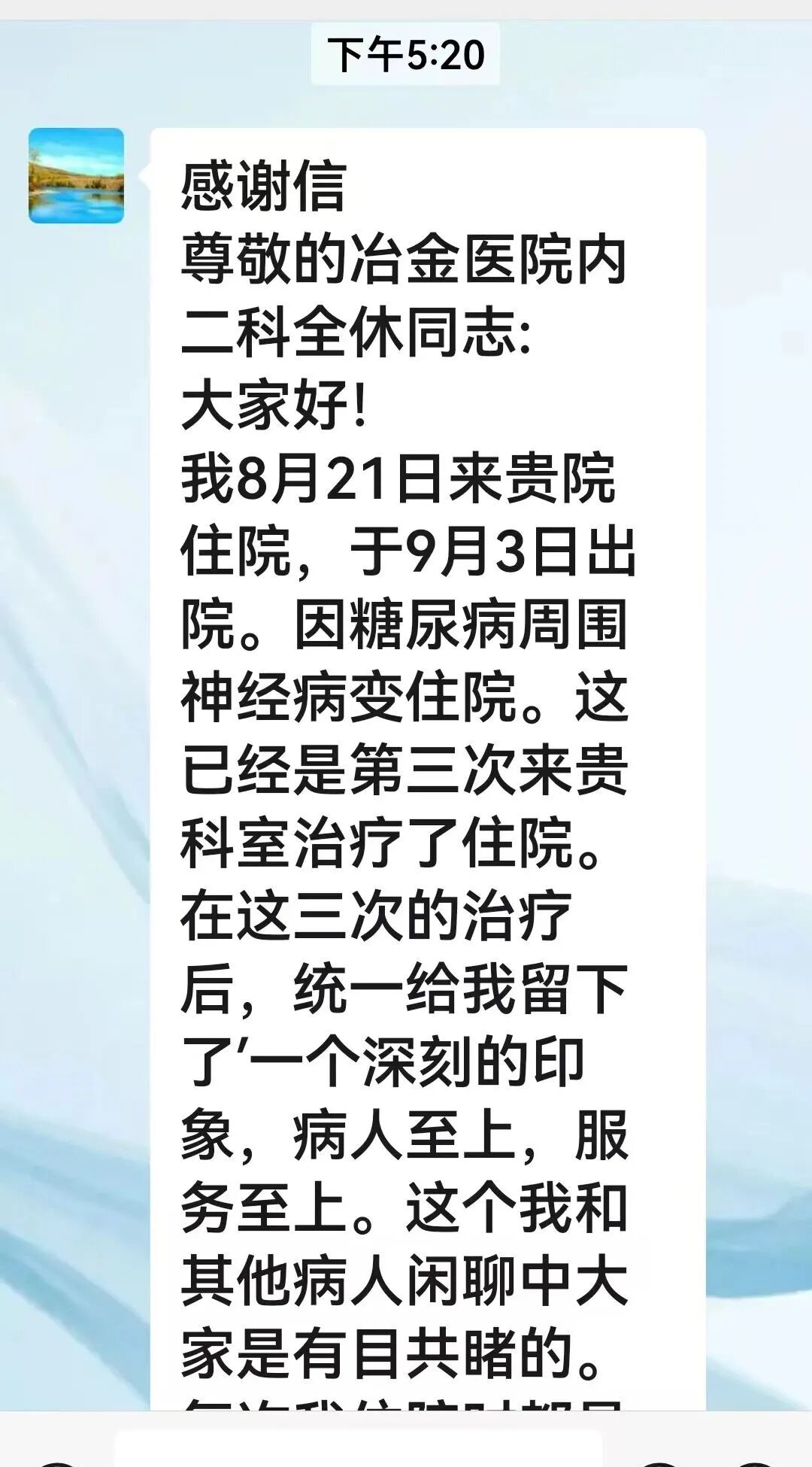 据了解,患者张女士,60岁。以“间断胸前区不适9年,加重伴头晕半月”主诉于8月21号入住陕西冶金医院内二科。诊断:眩晕综合征、腔隙性脑梗死、2型糖尿病。患者住院期间反复出现头晕,洪靖主任医师查房示:上述症状反复出现考虑脑供血不足引起。治疗用药:营养脑神经及中西医结合治疗后,患者于9月3日好转出院,住院期间对我们医生的医技及服务非常满意,特写此感谢信。