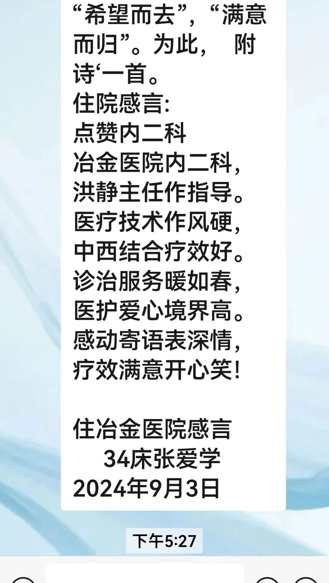 这是34床张女士发来的一封感谢信,向陕西冶金医院内二科医护人员表达了深深的感激之情。