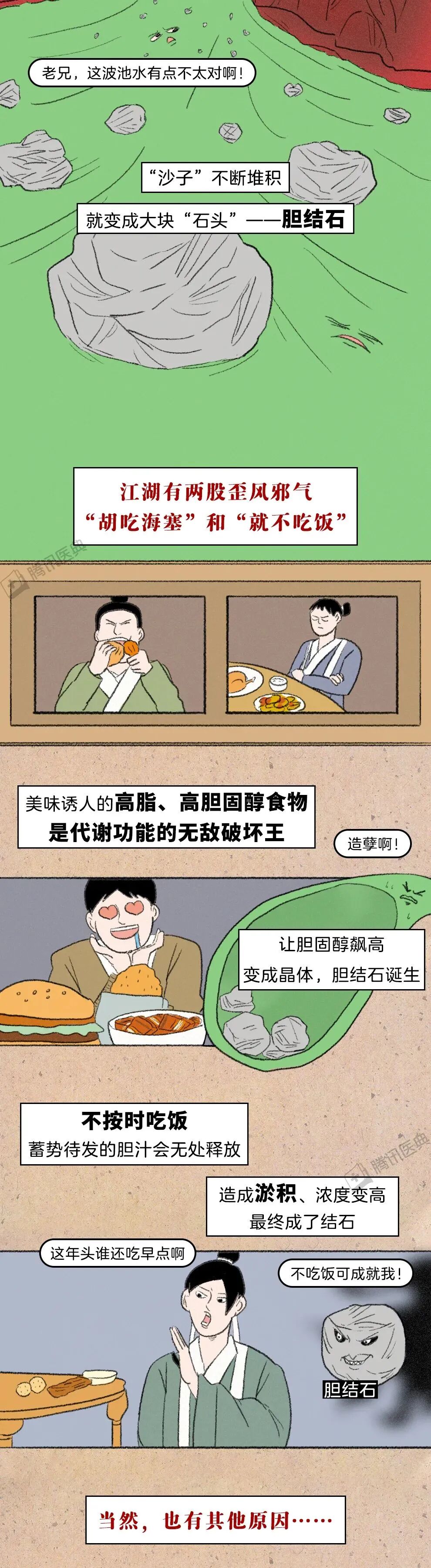 饭后久坐:可以影响胆酸的重新吸收,导致胆汁中的胆固醇与胆酸比例失调,胆固醇易沉积下来,形成胆结石。